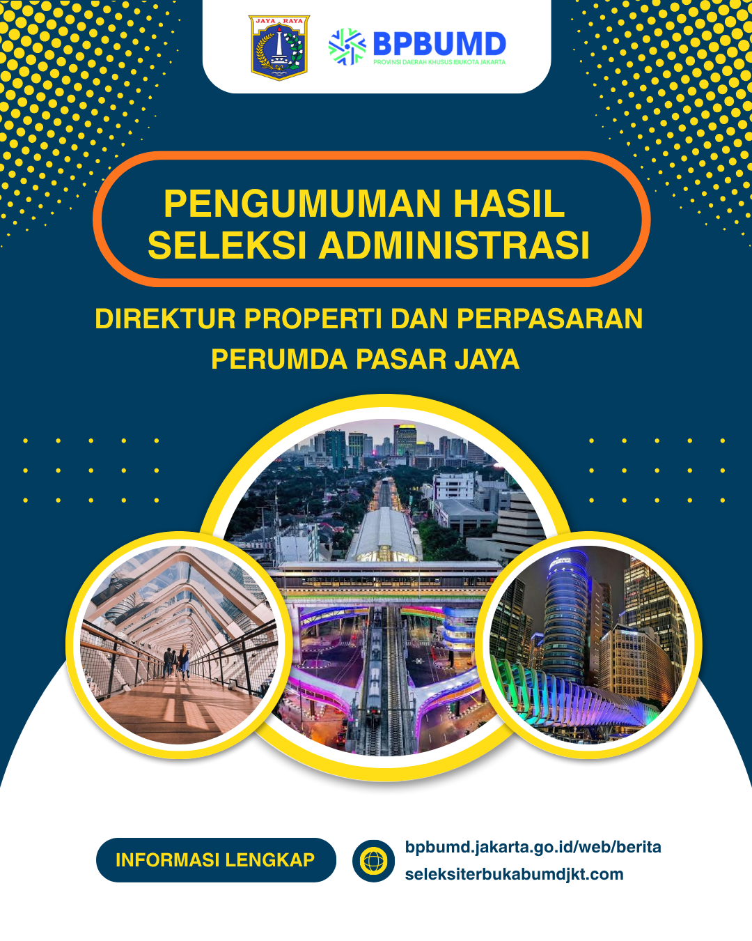 Merujuk Pengumuman Kepala Badan Pembinaan BUMD Provinsi DKI Jakarta Nomor 737/KG.11 tanggal 22 September 2025 tentang Seleksi Terbuka Jabatan Direktur Properti dan Perpasaran Perumda Pasar Jaya Tahun 2025, dengan ini kami umumkan hasil seleksi administrasi.